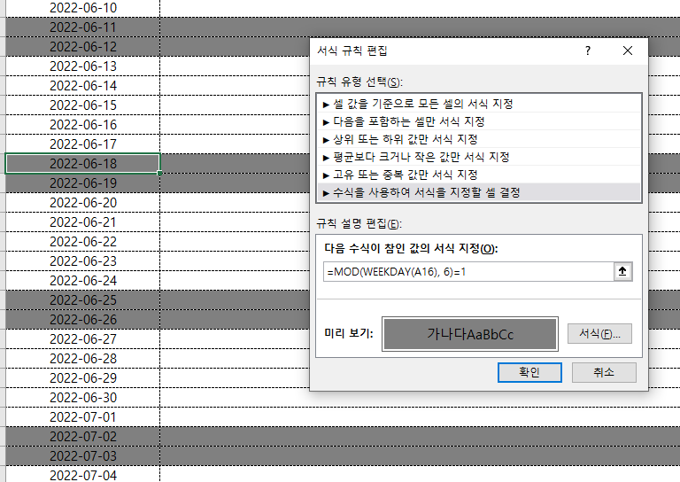 "엑셀 > 홈 > 조건부서식 > 새 규칙 "으로 색상을 표시할 수 있다. 마우스 드래그로 아래로 긁으면 매번 색상을 표시하지 않아도 된다.(현재 조건은 토요일과 일요일이면 배경색을 회색으로 표시하도록 설정)